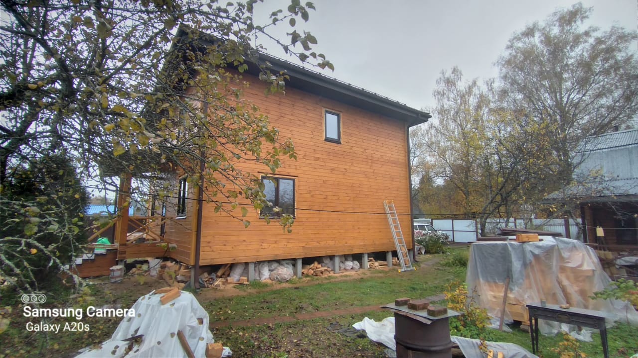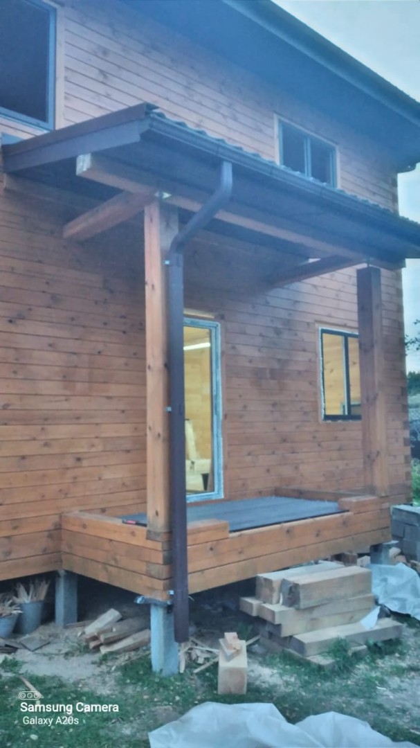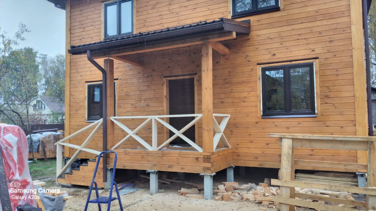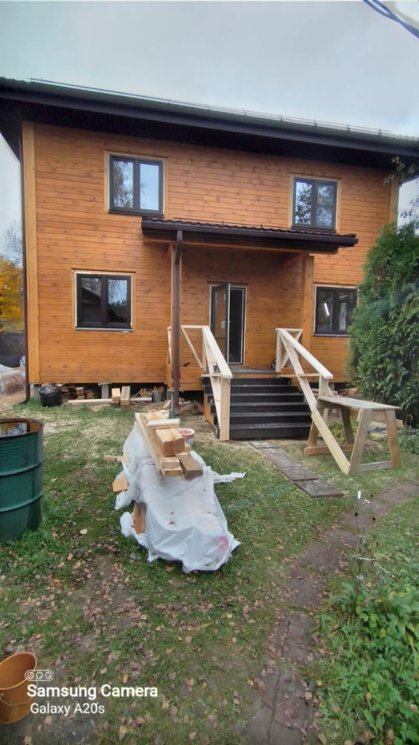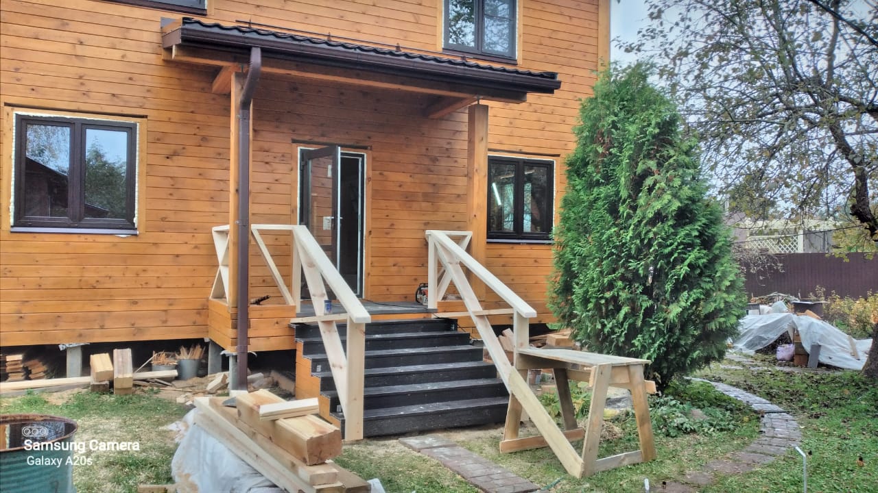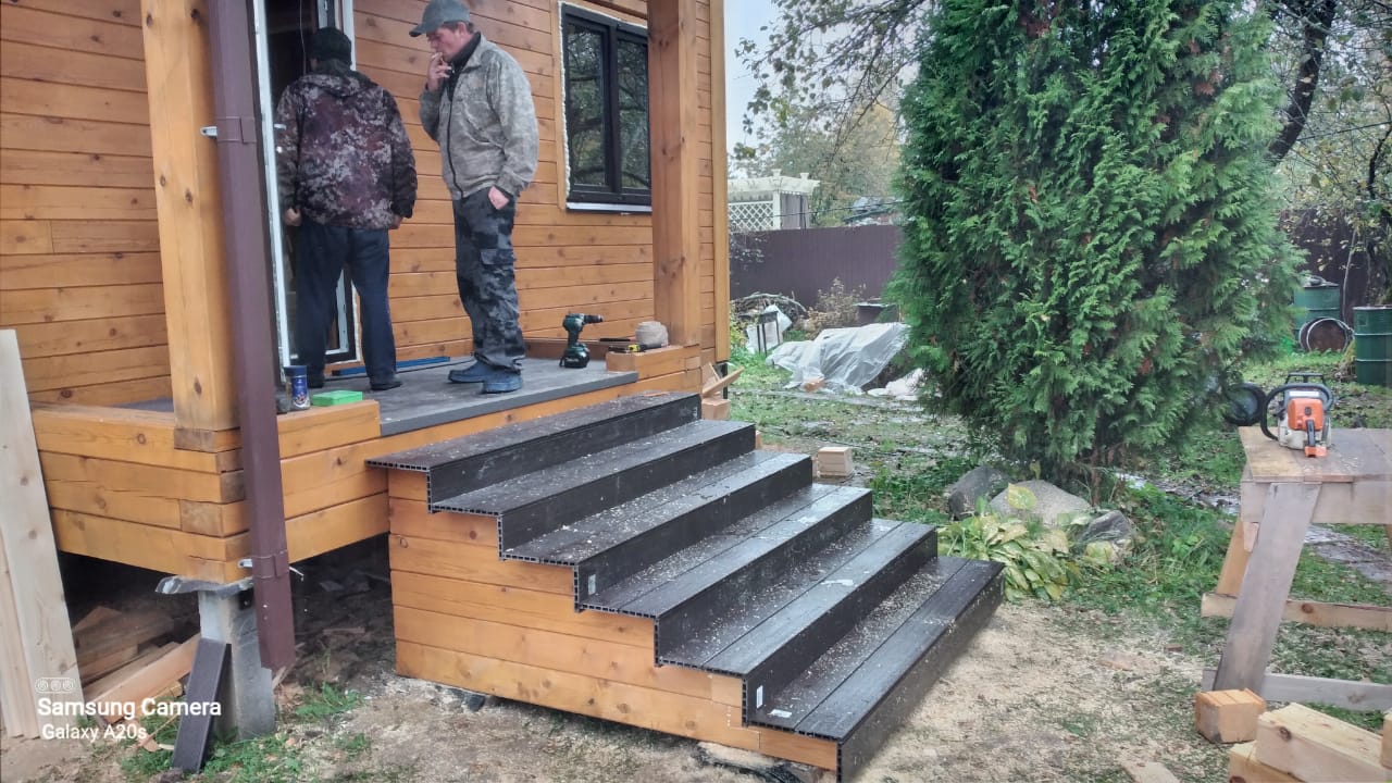 9.Обустройство крылец (настил пола террасной доской, монтаж потолка софитами, монтаж перил.)